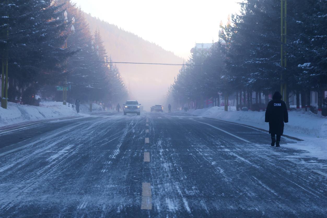 當(dāng)?shù)厝怂追Q的“冒白煙”,由于空氣中水汽遇超低溫直接凝華成冰晶,層層白霧如薄紗漫過(guò)群山、覆上民居,遠(yuǎn)處山巒若隱若現(xiàn),近處屋舍錯(cuò)落有致,宛若天上街市落人間,8時(shí)許冰霧濃度達(dá)峰值,街頭能見(jiàn)度顯著下降。