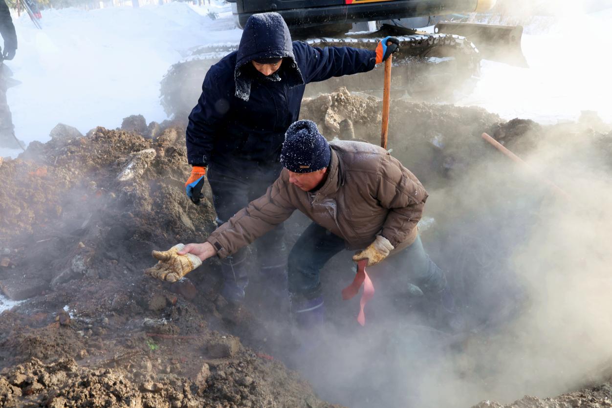 因地下管線錯(cuò)綜復(fù)雜,且極寒天氣易導(dǎo)致管道凍裂,搶修人員采取邊供暖、邊排水、邊人工開挖的方式推進(jìn)作業(yè),防止管線被凍擴(kuò)大輻射面。地面破開后熱水持續(xù)涌出,搶修人員輪番上陣,清理凍土、排查漏點(diǎn),歷經(jīng)3小時(shí)奮戰(zhàn),至11時(shí)40分挖出1.8立方米深坑,精準(zhǔn)定位漏點(diǎn)為供暖分線軟接頭老化,此時(shí)跑水量已達(dá)每小時(shí)4噸。為控制漏損,搶修人員當(dāng)即關(guān)閉分線閥門,受此影響,周邊20余戶居民供暖暫時(shí)中斷。