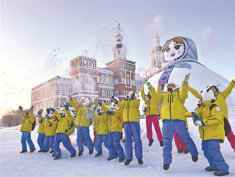來自四川的研學團隊在哈爾濱伏爾加莊園揚雪嬉戲。