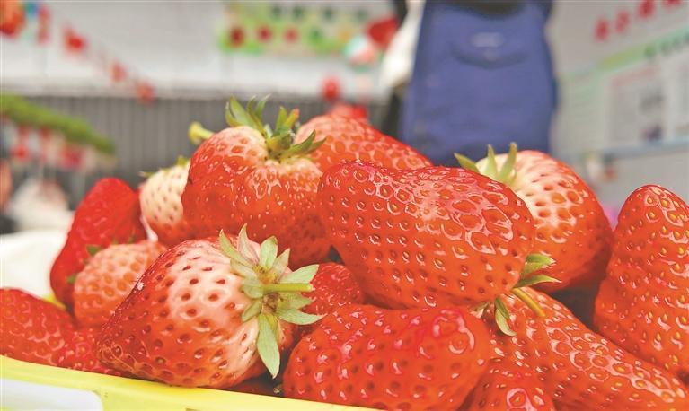 “這還有個大的,可紅啦?!贝渚G的草莓架下,小朋友拎著籃子來回穿梭,游客一邊采摘一邊品嘗。這里的草莓潔凈鮮亮,摘下來不用洗就能直接吃,咬一口,清甜的草莓汁溢滿唇齒。