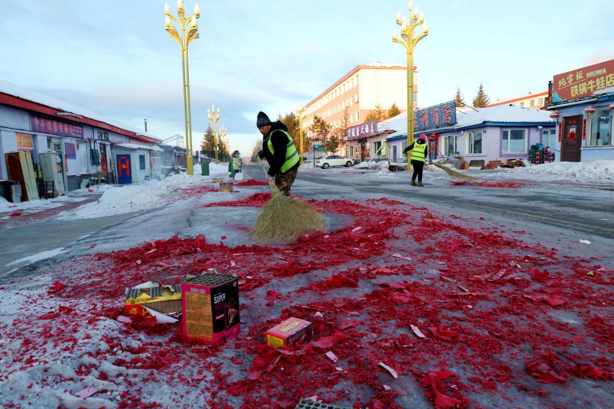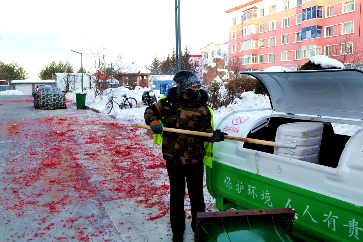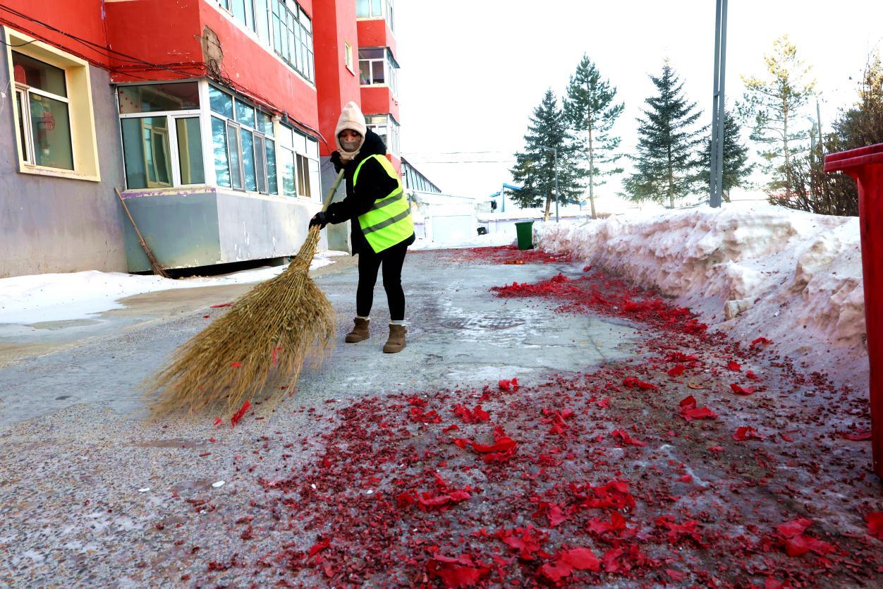 2月16日8點(diǎn),大街小巷年味正濃,鞭炮紙屑散落各處,行人寥寥。身穿黃馬甲的林業(yè)局環(huán)衛(wèi)工人已穿梭在街頭,帽子、睫毛凝滿白霜,手中掃帚不停揮舞,將鞭炮碎屑、生活垃圾及時(shí)清掃歸堆、裝車清運(yùn)。轉(zhuǎn)崗環(huán)衛(wèi)工人馬建民說(shuō):“我的責(zé)任區(qū)內(nèi)商戶多、居民多,春節(jié)期間工作量比平時(shí)多一倍,必須打掃干凈,讓大家過(guò)個(gè)舒心年。”在全體保潔員的奮戰(zhàn)下,居民區(qū)實(shí)現(xiàn)鞭炮紙屑隨放隨清、生活垃圾日產(chǎn)日清,大街小巷始終整潔有序。