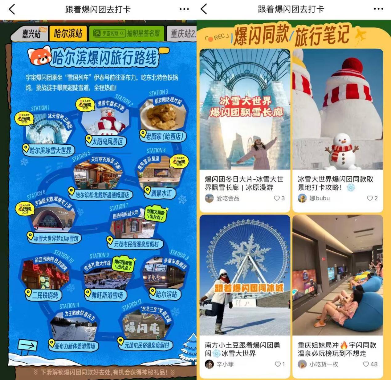 “跟著爆閃團(tuán)春節(jié)游中國”打卡活動的開展,讓屏幕里的冰雪快樂照進(jìn)了現(xiàn)實。游客們紛紛追隨宇宙爆閃團(tuán)的腳步,在冰雪大世界打卡拍照,在太陽島雪博會邂逅巨型雪雕,在亞布力滑雪場體驗飛馳的快樂,在老廚家品嘗節(jié)目同款美食。