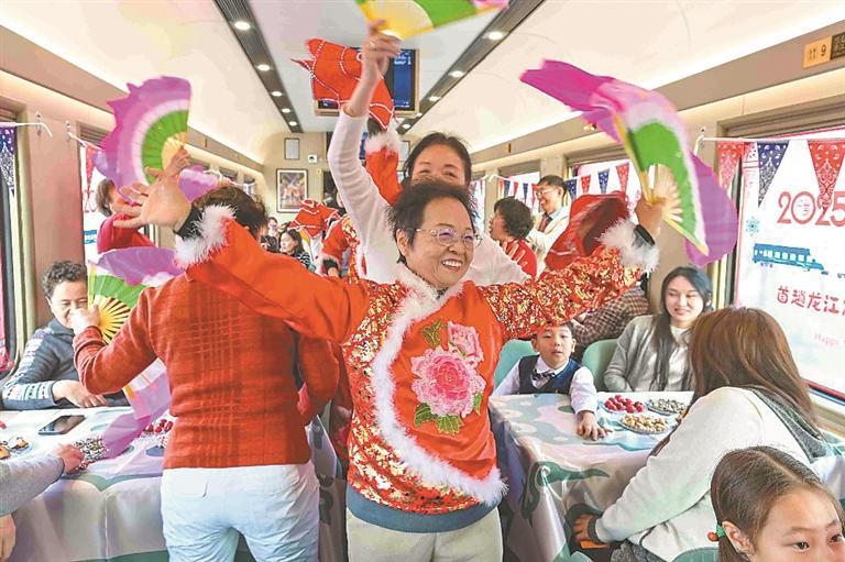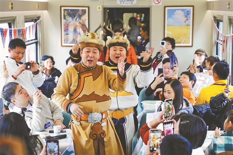 2月5日18時(shí)20分,K7041次“東北大花”主題列車從哈爾濱站緩緩駛出,一路向北,駛向漠河。車廂內(nèi),來自大興安嶺的鄂倫春族非遺代表性傳承人,現(xiàn)場(chǎng)展示用樺樹皮制作的手工藝品,列車工作人員身著民俗服飾帶領(lǐng)游客剪窗花,東北秧歌、二人轉(zhuǎn)表演更是點(diǎn)燃了旅途熱情。